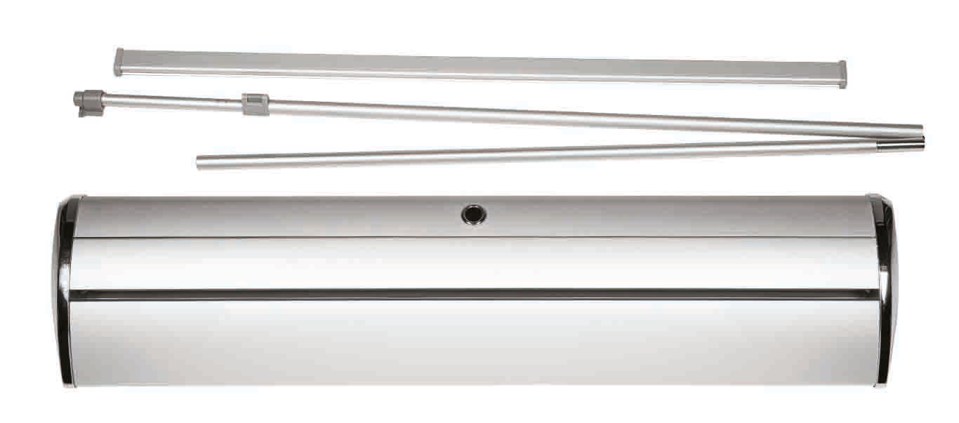 Mit dem Roll-Up Banner von f-Werbung in Erfurt erhalten Sie ein Banner aus der Standard-Reihe. Dieser ist Silber eloxiert und kommt mit einer Klemmschiene sowie verchromte Endkappen daher. Die beiden verchromten Endkappen stechen bei diesem System besonders hervor und verleihen Ihnen einen exclusiven Auftritt. Auch für Messen, Events, Ausstellungen, Werbeaktionen und Ähnliches eignet der Roll-Up Banner sich ideal, denn er kann einfach und bequem in der mitgelieferten Transporttasche transportiert werden.