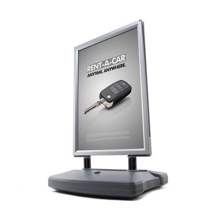 Speziell für Ihre Werbung in windigen Bereichen ist der Kundenstopper WINDTALKER® von f-Werbung in Erfurt die optimale Lösung. Sein mit Wasser oder Sand befüllbarer Standfuß bietet in Verbindung mit den Spezialfedern aus Stahl eine hohe Standfestigkeit. Für den einfachen Transport sind im Standfuß Rollen integriert. So können Sie den Kundenstopper trotz des Standgewichtes einfach bewegen. Der Aluminium-Schnellwechselrahmen kann doppelseitig mit Plakaten bestückt werden und garantiert Ihnen auch bei hohen Windstärken eine auffällige Werbemöglichkeit.