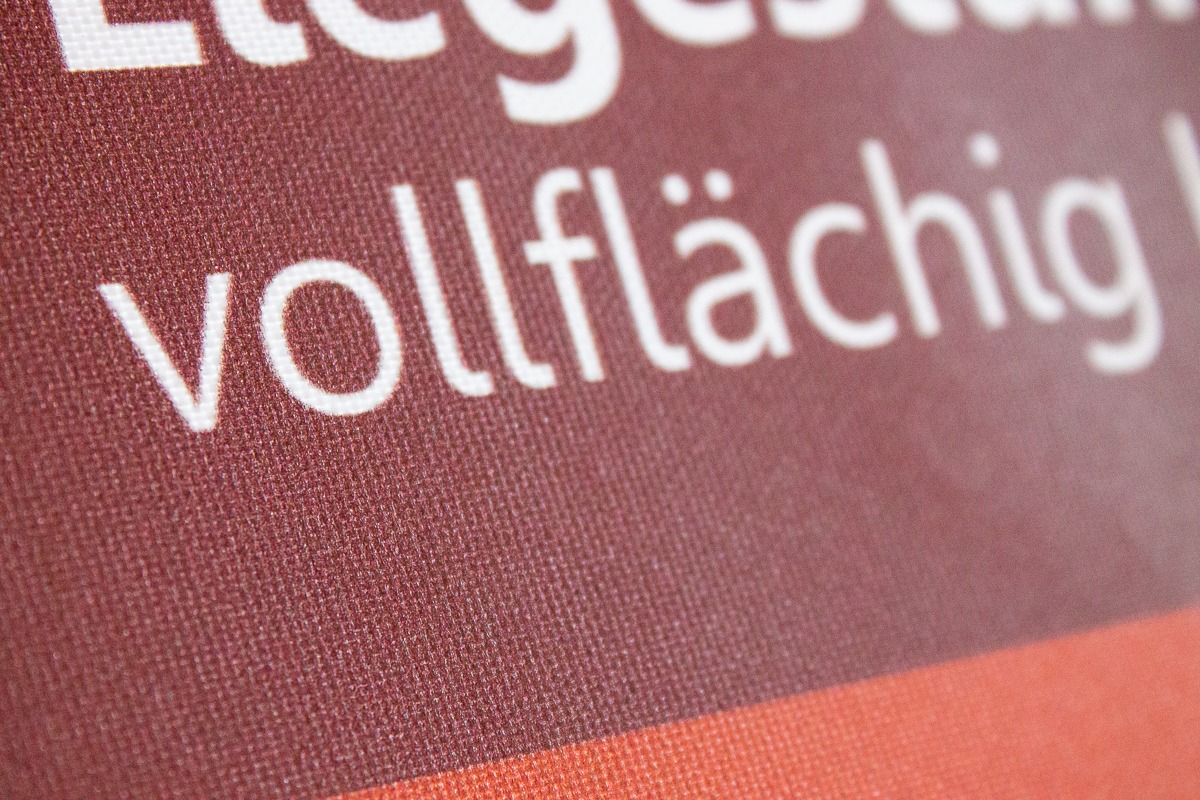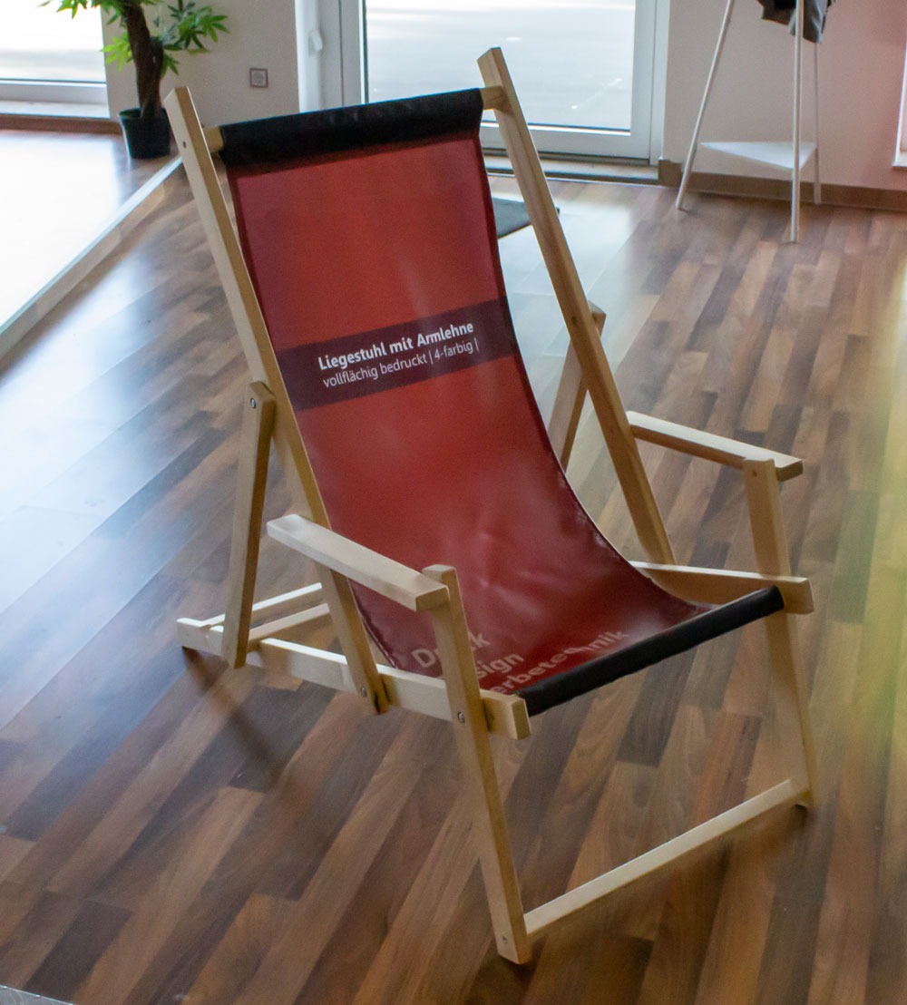 Hochwertiger Klappholzliegestuhl mit Armlehne mit strapazierfähigem Latexdruck drucken. Strandstühle bedruckt in Erfurt von f-Werbung.